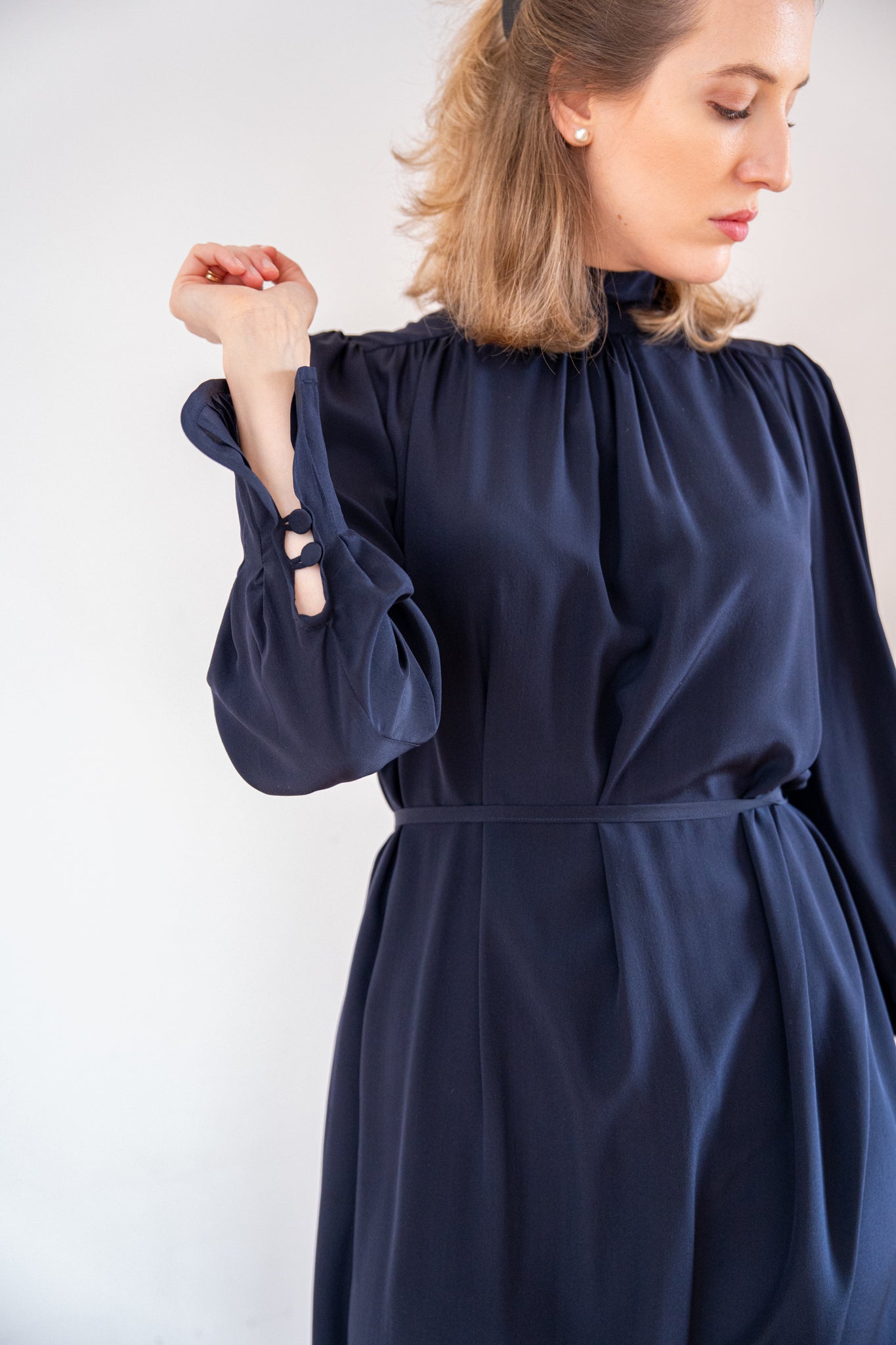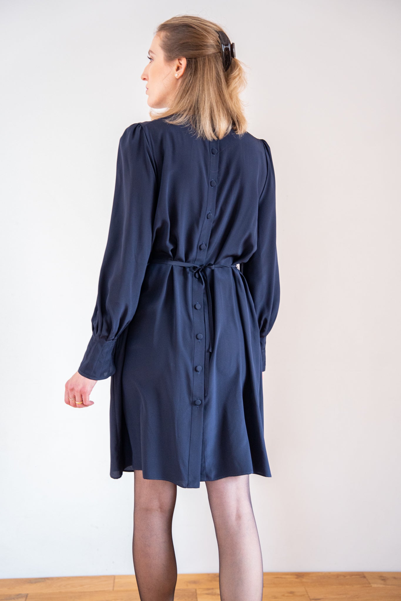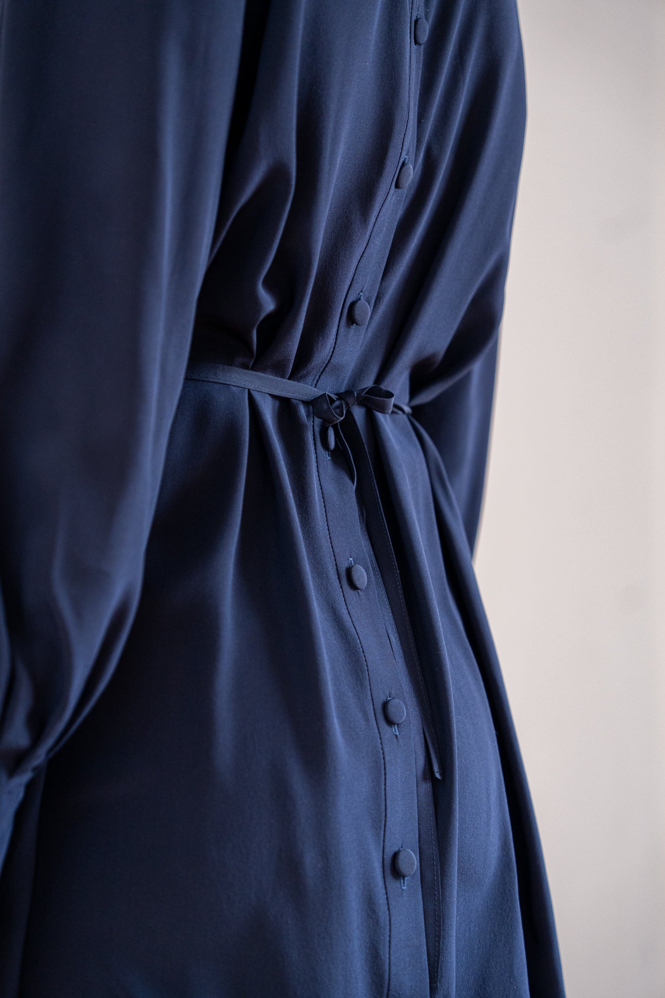 Luxusné šaty z hodvábu voľného strihu s krásnym vypracovaním rukávov, vreckami a opaskom. Na zadnej strane zapínanie na gombíky, ktoré sú ručne obalené.