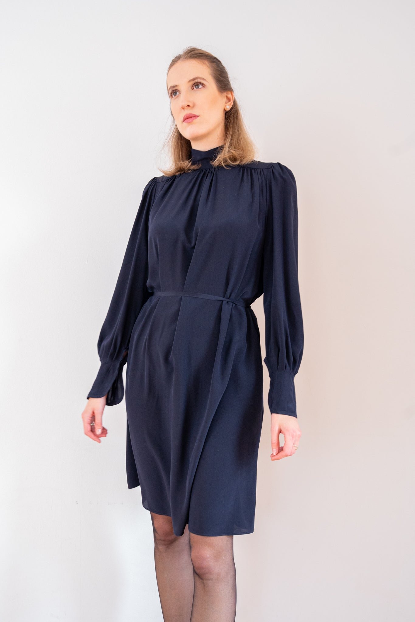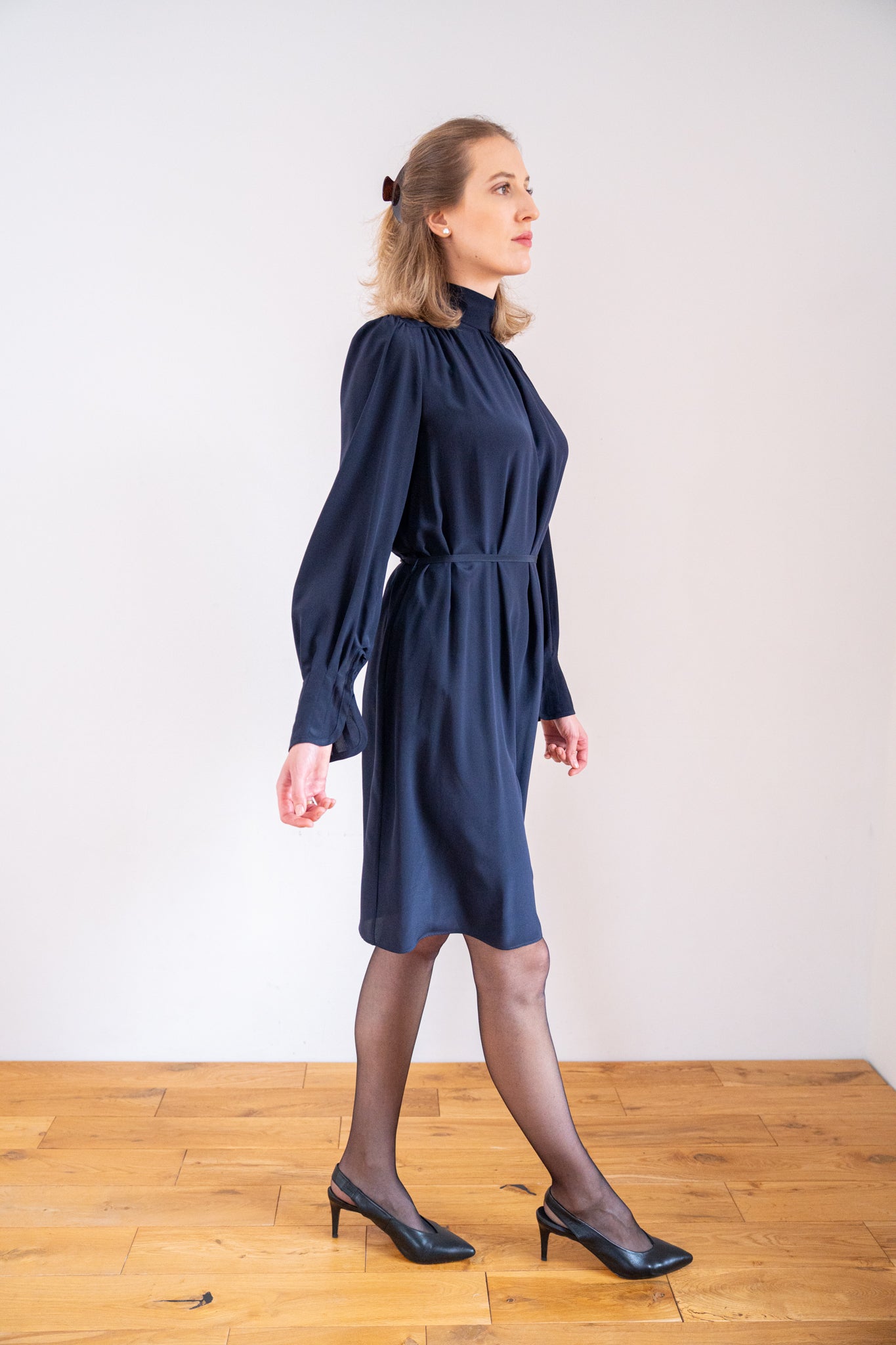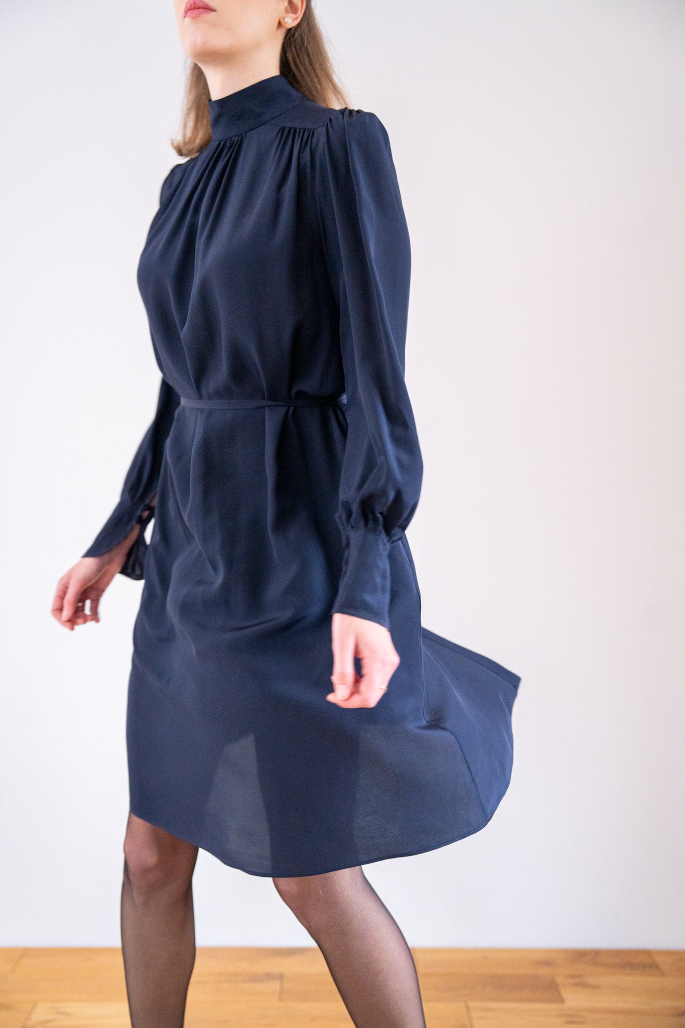 Luxusné šaty z hodvábu voľného strihu s krásnym vypracovaním rukávov, vreckami a opaskom. Na zadnej strane zapínanie na gombíky, ktoré sú ručne obalené.
