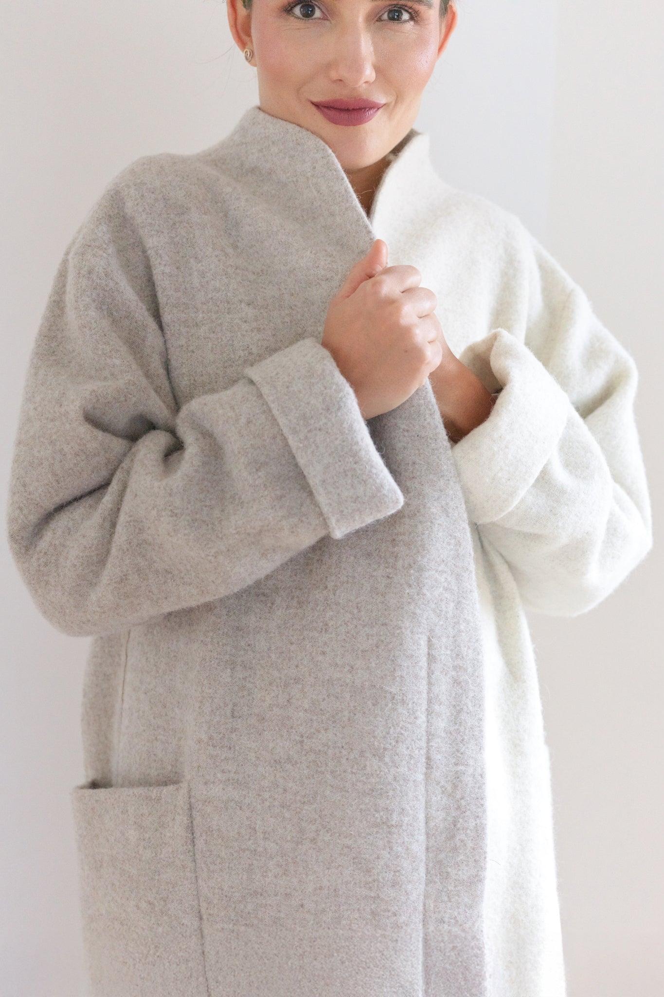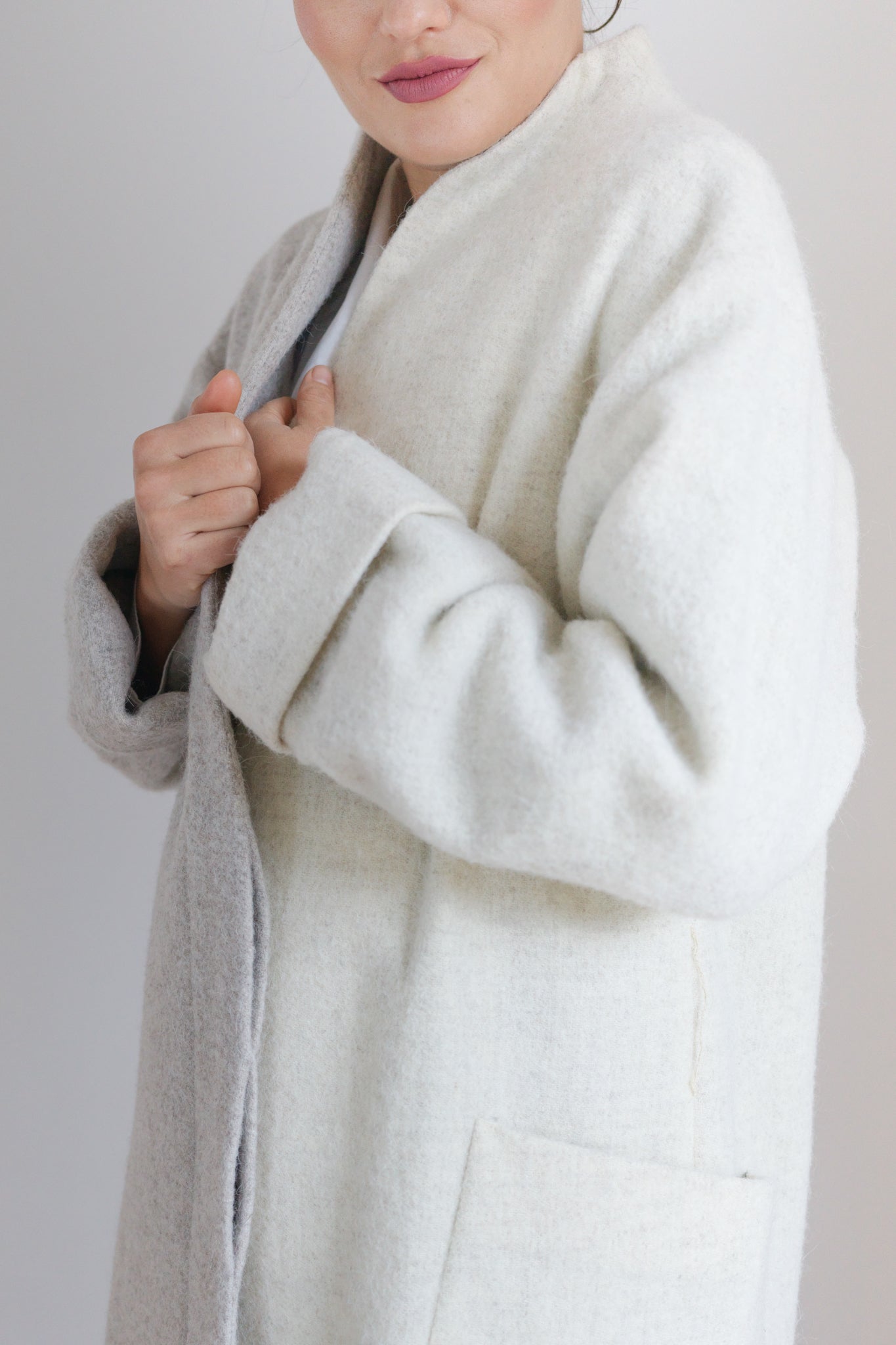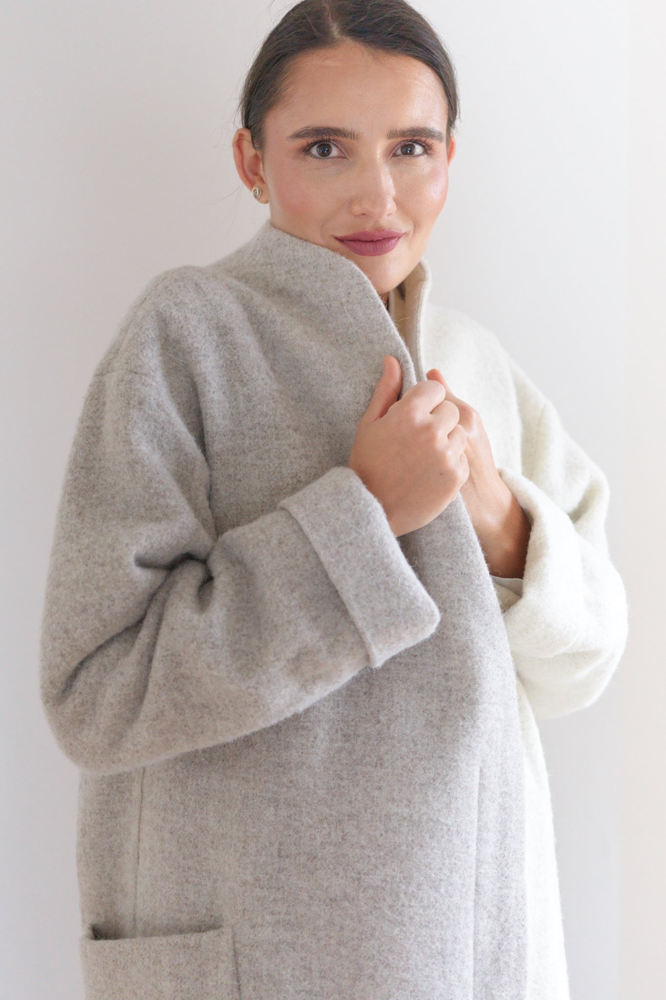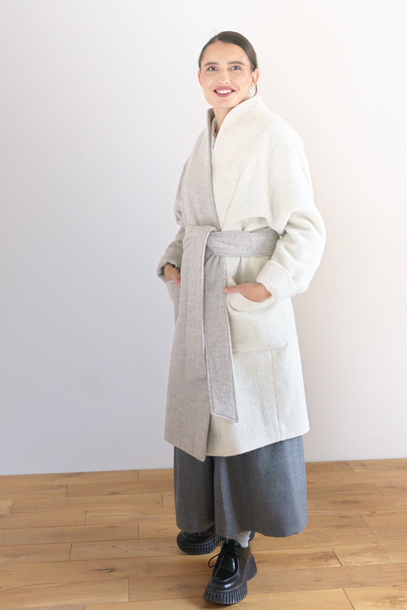 Pohodlný celopodšitý zimný kabát s opaskom Má skryté zapínanie na gombíky a praktické veľké vrecká. Voľný oversized strih. Kombinujte s hrejivým merino alebo kašmírovým rolákom. Kabát je vyrobený z kvalitného vlneného materiálu.