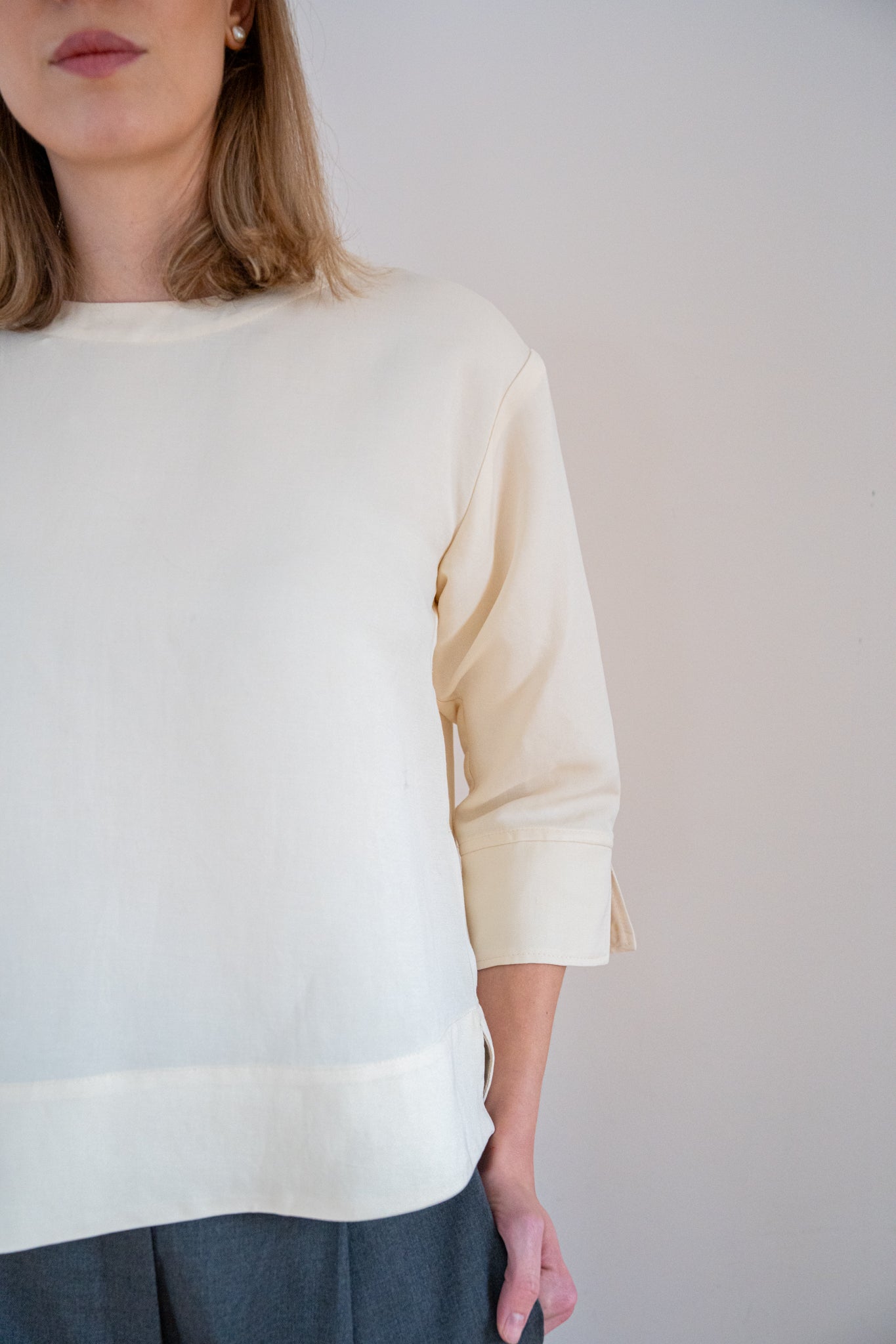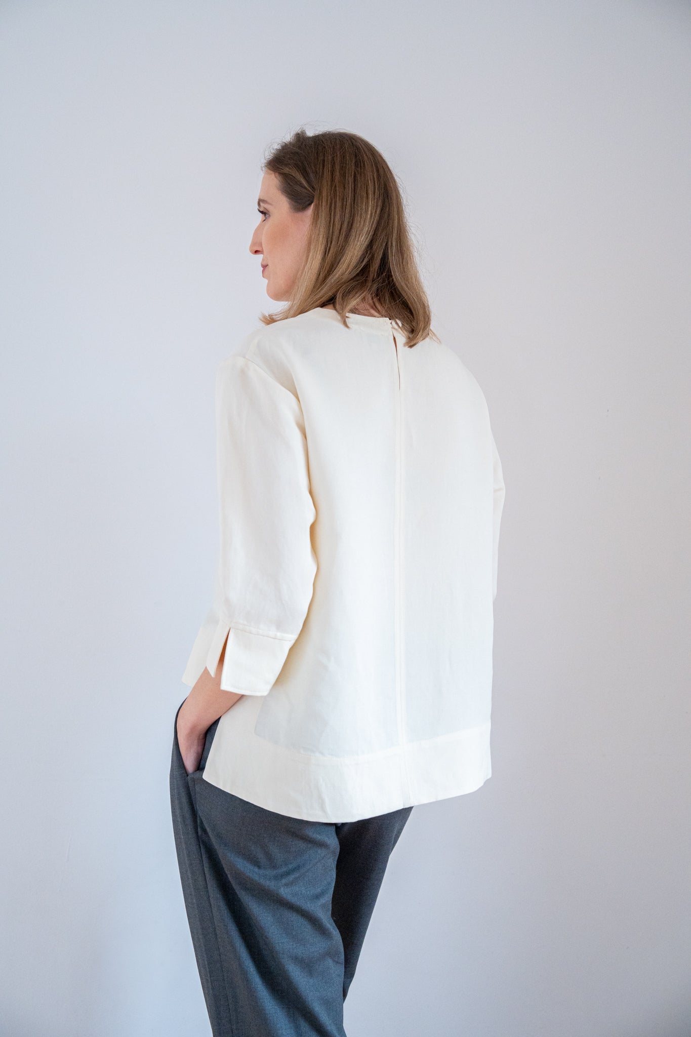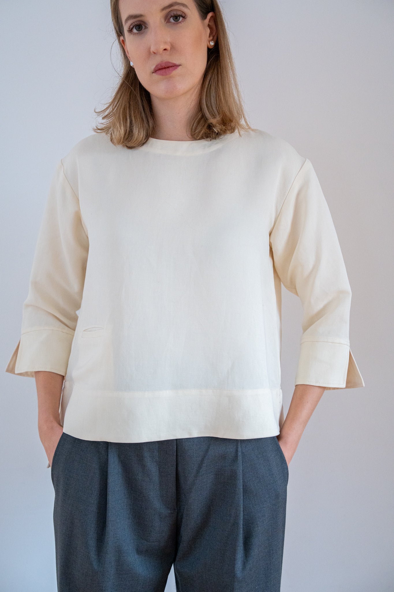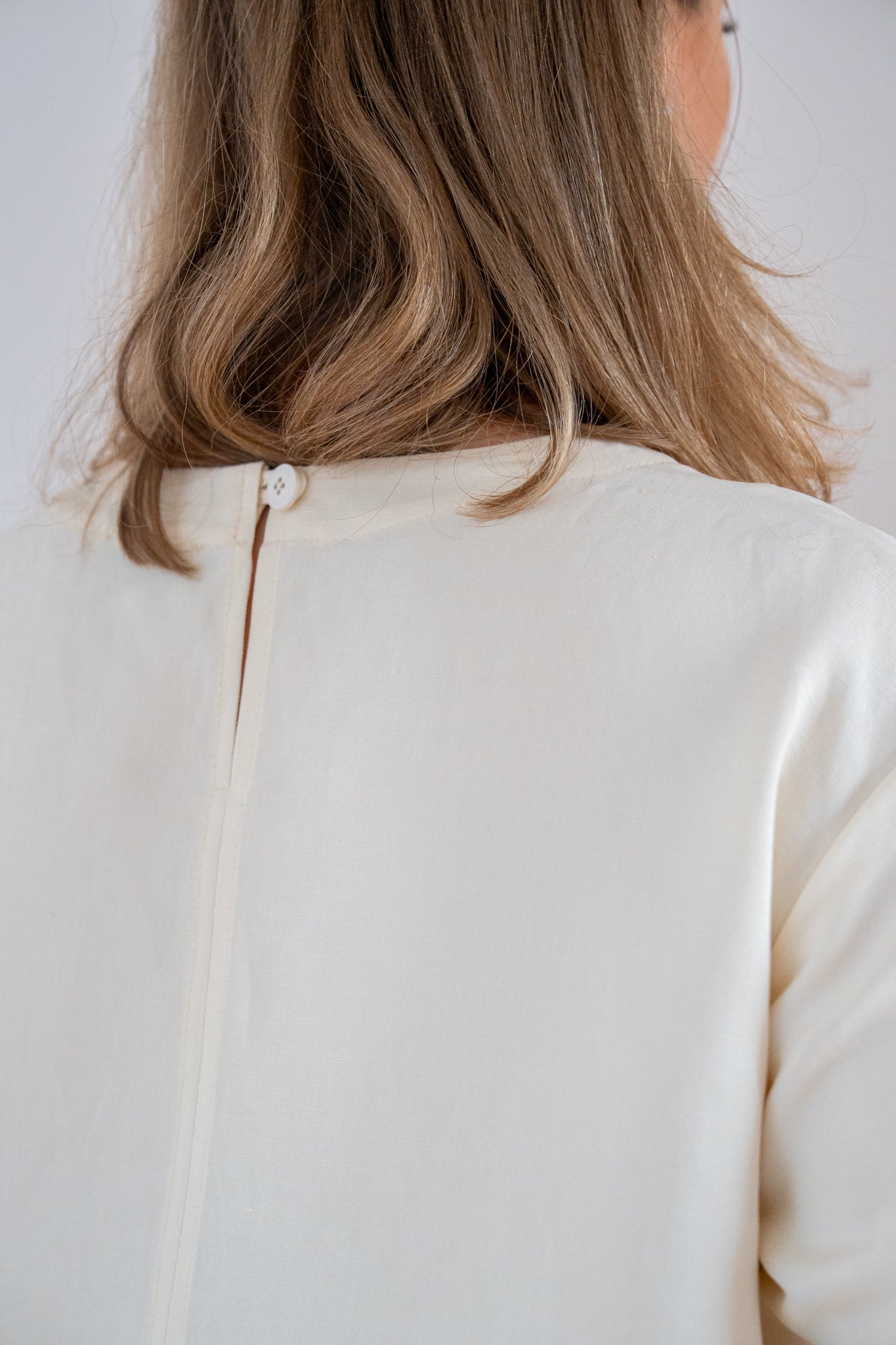 Voľný top so skrátenými rukávmi. Vpredu má funkčné vrecko, na krku zapínanie na gombík. Skvelý pohodlný kúsok na každodenné nosenie. Kombinujte so zavinovacím opaskom Alica v rovnakej alebo kontrastnej farbe.