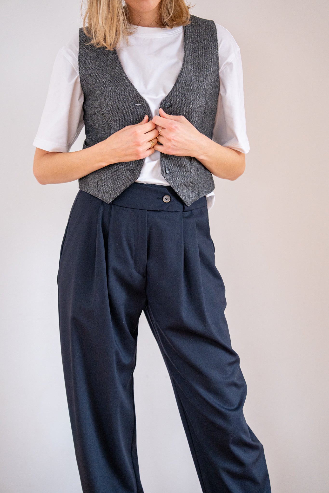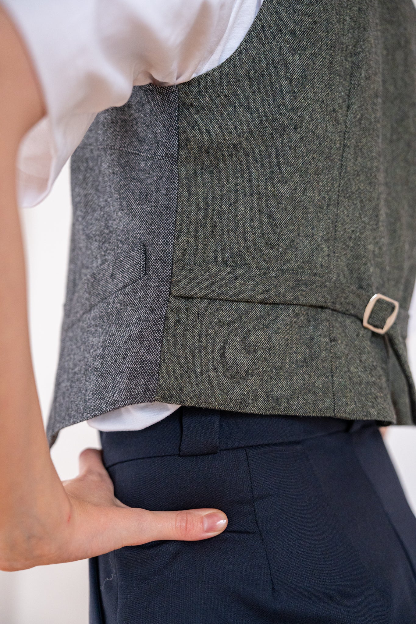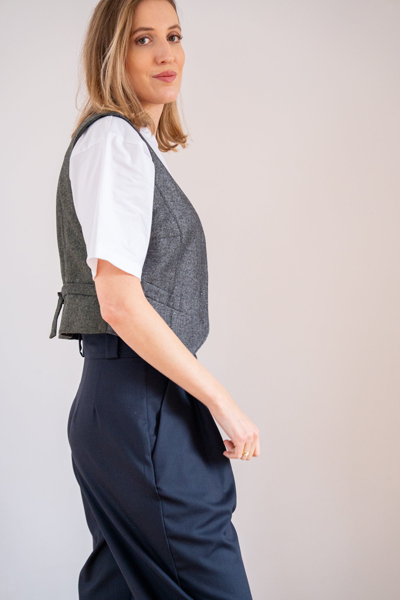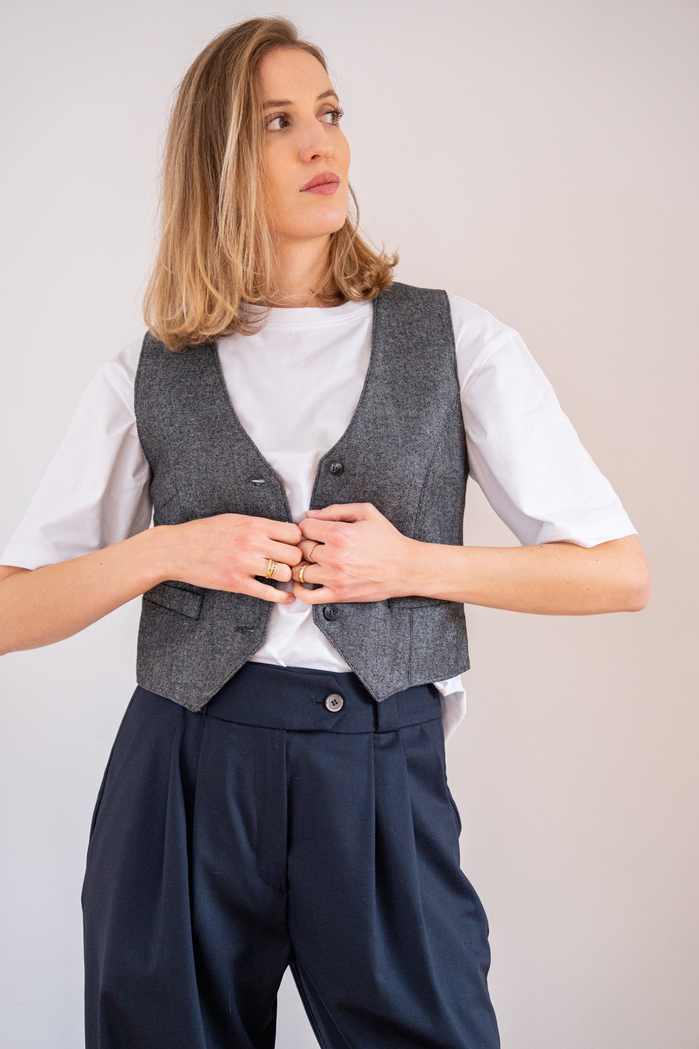 Krátka tvarovaná vesta s véčkovým výstrihom. Zapínanie je na gombíky, s prednými vreckami. Vzadu má pracku na dotvorenie lichotivej siluety. Je podšitá podšívkou. Tento nadčasový odev môžete nosiť na holé telo, alebo kombinovať s košeľou, tričkom...